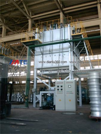 結(jié)構(gòu):立式鋁合金淬火爐的結(jié)構(gòu)具有熱風(fēng)循環(huán)通道和攪拌風(fēng)機(jī),使?fàn)t內(nèi)熱風(fēng)在導(dǎo)流板的作用下定向循環(huán),保溫終了時(shí)爐內(nèi)金屬溫差。淬火水槽置于加熱爐正下方,從而縮短工件淬火轉(zhuǎn)移時(shí)間,提高工件固溶質(zhì)量。工件料架進(jìn)出和爐門啟閉均為電控,操作方便。動(dòng)作間均設(shè)有連鎖裝置,可靠。本爐主體為立式爐門在下端的加熱爐,加熱元件置于內(nèi)爐壁,壁的內(nèi)側(cè)裝有活絡(luò)門板,它與內(nèi)壁形成一個(gè)氣流循環(huán)通道,爐的頂部置有一個(gè)大風(fēng)量的軸流式風(fēng)扇和道流結(jié)構(gòu),構(gòu)成熱風(fēng)循環(huán)系統(tǒng)。爐底門由四走輪和驅(qū)動(dòng)機(jī)構(gòu)組成一個(gè)啟閉裝置,爐底門與加熱爐殼用砂封密封。工件料架進(jìn)出爐膛靠升降裝置實(shí)現(xiàn)。它由爐內(nèi)吊鉤連接吊桿上通過(guò)向爐外的環(huán)形鏈和卷?yè)P(yáng)機(jī)等組成。在地平面鋼軌上置有一裝料小車,可載料架進(jìn)入裝料和卸料。